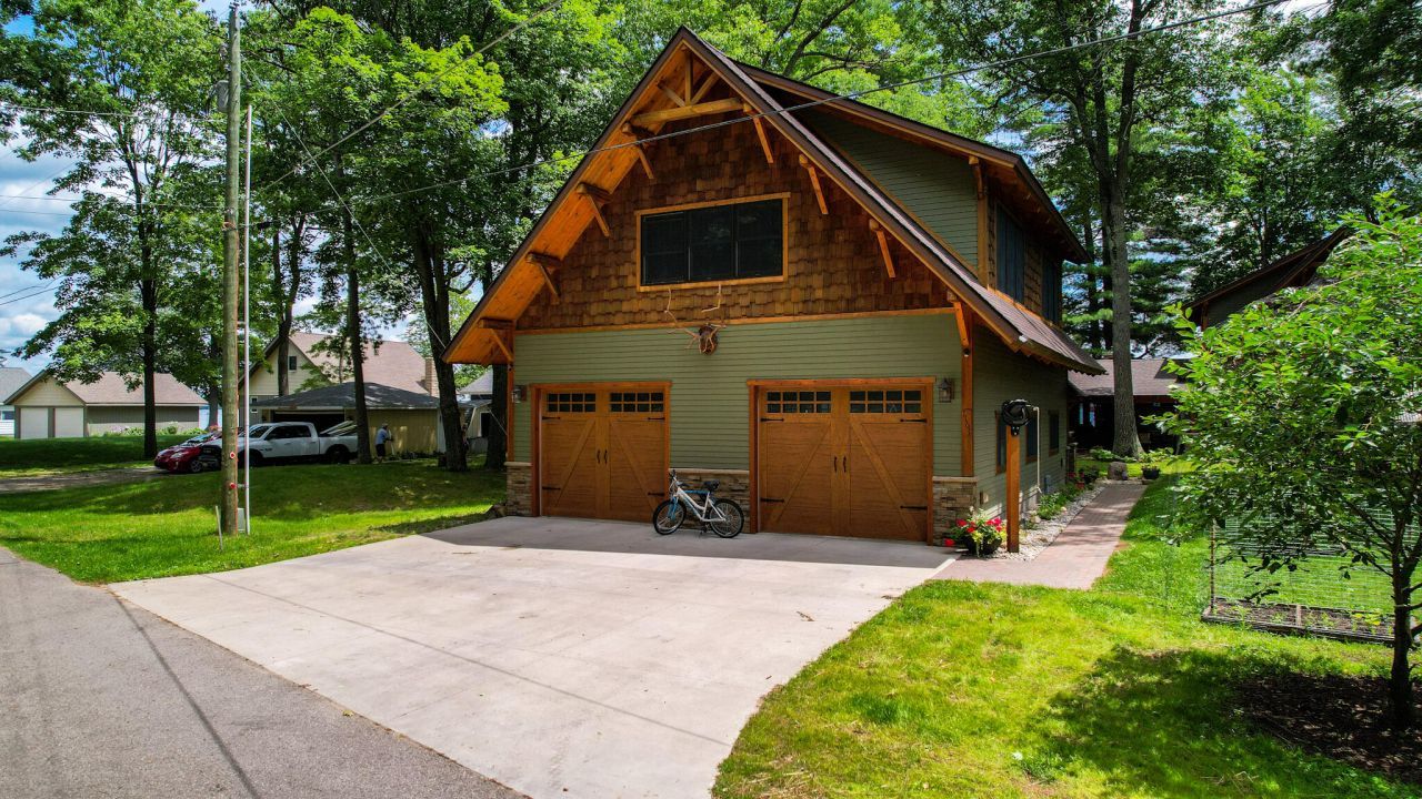 Own your very own island paradise with this stunning 4 bed, 3 bath custom Amish-designed home. Set on 100 ft of sandy-bottom waterfront with a rock seawall and private dock, this home showcases expert craftsmanship throughout. Features include granite countertops, black walnut cabinets, oak wood and ceramic tile floors, vaulted ceilings, and 3 sliding glass doors offering breathtaking lake views. The entire upper level is a luxurious master suite with a walk-in closet, gas fireplace, stand-up shower, and a hammered copper soaking tub overlooking the water. Enjoy natural gas boiler heat, a freestanding wood stove, cedar siding, ceiling fans, custom lighting, and a built-in patio grill. The spacious garage includes a 30x40 heated bonus room,ideal for a man cave, guest space, or studio