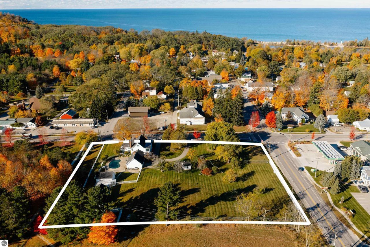 What if the most desirable venue in Empire is simply waiting to be reimagined? Situated on over 3 acres in the heart of downtown Empire ??? walking distance to Empire Beach, local shops, and restaurants ??? this rare offering combines scale, flexibility, and location in a way that is nearly impossible to replicate. The expansive main residence features multiple gathering spaces, two fireplaces, a Viking professional double oven cooktop, a natural light-filled three-season room, and a private office with custom cherry built-ins from floor to ceiling. Upstairs you???ll find four bedrooms ??? three with private ensuite baths, including two primary suites. A finished third-level attic spans the length of the home, providing additional flexible space and storage.Outdoor amenities further expand the possibilities. The in-ground pool is complemented by three accessory buildings: a 28x16 pool house with architectural character and an unfinished second level, a 40x24 garden house/workshop with 14 ft ceilings, drive-in garage door, and 240-volt service, and a 24x12 pond house with electricity powering the pond and irrigation systems. Included in the sale is a separate high-visibility corner parcel at M-22 and M-72, also zoned residential/commercial, offering exceptional exposure and long-term income potential. With mixed-use zoning in place (buyer to verify intended use with the Village of Empire), the framework exists for a boutique hospitality concept, destination retreat, live/work compound, or event-based venture. Moments from Sleeping Bear Dunes National Lakeshore, Glen Lake, and a direct route to Traverse City, properties with this scale, zoning flexibility, and positioning rarely become available in Empire. This is more than a home. It is an opportunity to create something iconic.