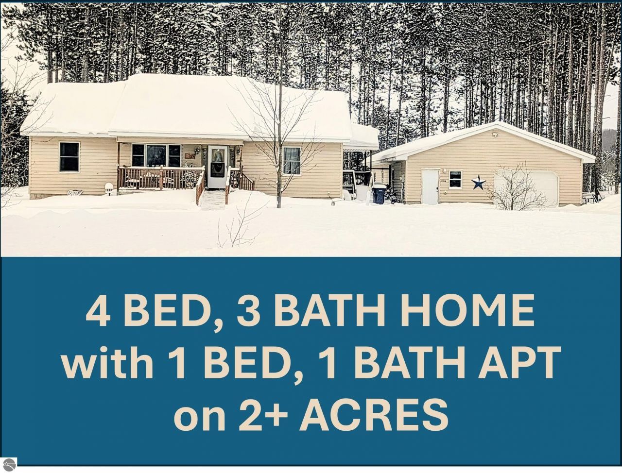 Experience ultimate versatility with 4 bedroom, 3 bath home on 2+ acres, PLUS garage with 1 bedroom, 1 bath apartment. Spacious and solid inside and out, this home features in-floor radiant heat, 8'' walls, foam-backed vinyl siding, beautiful tongue & groove ceilings and hardwood + tile floors. Huge game area in basement, plumbed for a wet bar, plus a bonus office space. 2 car garage includes apartment with kitchenette, perfect for guests, extended family, or as a rental to offset costs. Ramp to covered front porch, large back deck, and fenced yard, all on 2+ acres. Convenient to Traverse City, Shanty Creek, Torch Lake and all the 4-season activity Northern Michigan has to offer. A LOT of house and a great value, priced well below recent appraisal.