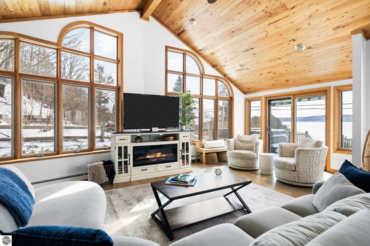 Crystal Lake living begins here, with 75 feet of private sandy frontage in one of Northern Michigan???s most sought-after locations. This waterfront property offers a rare opportunity to enjoy the beauty of Crystal Lake while holding exceptional long-term value in an unbeatable setting. The home features 6 bedrooms, 3.5 bathrooms, and over 4,200 square feet of living space, offering plenty of room to gather, relax, and take in the surrounding lake views. The layout includes a main house along with a carriage house connected by a charming boardwalk, creating a unique and flexible living arrangement. Recently updated and offered fully furnished, the home is move-in ready and designed for effortless lake living from day one. The property has also been a successful short-term rental for the past five years, offering a strong track record for those interested in continuing its use as an income-producing retreat. Outside, the property provides direct access to the clear blue waters that make Crystal Lake so well known. Spend your days swimming, boating, or simply enjoying the peaceful setting along the shoreline. A detached four-car garage includes a spacious loft with a bath above, creating additional space that may serve as guest quarters, recreation space, or storage. Crystal Lake properties like this rarely become available. With generous frontage, significant living space, and a proven rental history already in place, this property represents an exceptional opportunity to own along one of Northern Michigan???s most iconic lakes.