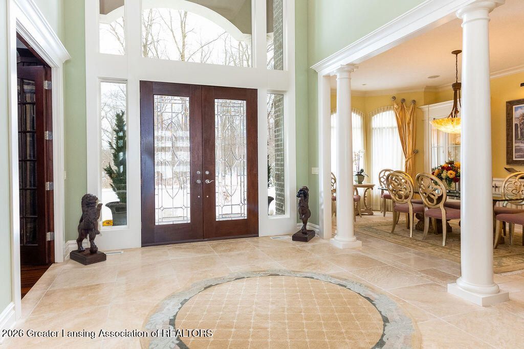 Lake Lansing on the water! Rare offering for this 9,000+/- sq. ft. 6-bedroom 7.5 bath two-story nestled on over 2 lots directly on the water! Over the top quality and finish work throughout with 10-foot ceiling heights, 8-foot interior doors, luxurious hydraulic heating on the main floor, 4 fireplace fronts, Grabil & Decora cabinetry, amazing manufactured all stone/concrete exterior, 2x6 construction, plus so much more! Spectacular and dramatic foyer entry offering a sweeping wrought iron circle staircase with enlarged tumbled marble flooring with overlooks. Magnificent great room including built-ins plus floor to ceiling windows; breathing the outside in. The main floor library includes stunning panel molding, built-ins, and gleaming hardwood flooring accented with a bay window. The formal dining room is enchanting with custom China door display cabinets and a pretty bay of windows. The Grabil kitchen is simply breathtaking, including a sub-zero refrigerator, Dura ovens, and 6 burner gas range. A beautiful fireplace, coffee bar and an amazing walk-in pantry. A gleaming granite center island, eating bar with seating, plus special custom cabinet inserts including a beverage refrigerator and yummy backsplash! The eating area is simply amazing with direct water access through the oversized doors to the outside covered deck & patio with direct access to the lake. Special landscaping and gardens. The laundry room and drop zone also is a planning center with a walk-in closet. 4+car heated garage with built-ins, sink, floor drains, plus a staircase to the basement! The full glitzy bath has a changing room, two special vanities, plus a separate stool and shower room for easy access from the water! Enjoy the spa room with a hot tub, exercise and game space, plus an out of a magazine pub game room, stacked stone fireplace, full wet bar, media space and more! The 4-season sunroom with inlaid floors and porch paneled ceiling, soaks in the eastern and southern sunlight and a wonderful theater room; screen & projector included. The first-floor primary suite will take your breath away offering tray ceilings, sitting area in the bay, two amazing walk-in closets with built-ins, plus a spa bath with a walk-in shower, air jet tub and miles of vanity space. 5 oversized bedrooms on the 2nd floor, each with a walk-in closet and full bath. Two have access to a balcony overlooking Lake Lansing, one has special tray ceilings and a bunk room with a fabulous extra-large bath and closet space. If this is not enough the third-floor family room with special windows nestled in a dormer with full views of the Lake, may do it. The basement has three daylight windows plus large storage and is under the entire home. Circle driveway! Great seawall with sandy bottom. Built-in speakers, amplifiers and receivers. Loads of upgrades and extras throughout! Priced way below duplication cost. This cottage and home in one are a living dream and waiting for new owners!